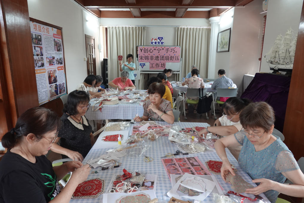 3、9月11日上午,女青年会在鹤洞会所顺利举办“心‘宁’手巧——非遗宋锦团扇舒压工作坊”,以传统宋锦团扇制作为载体,为照护者提供一个释放压力、静心养性、收获成就感的艺术窗口,共有14名照护者参与活动。